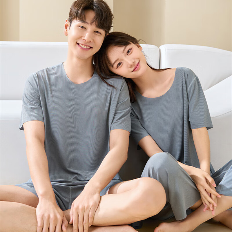 宝娜斯(BONAS)睡衣女夏季冰丝螺纹薄款速干短袖长裤可外穿男士家居服套装 女款-薄雾蓝 XL