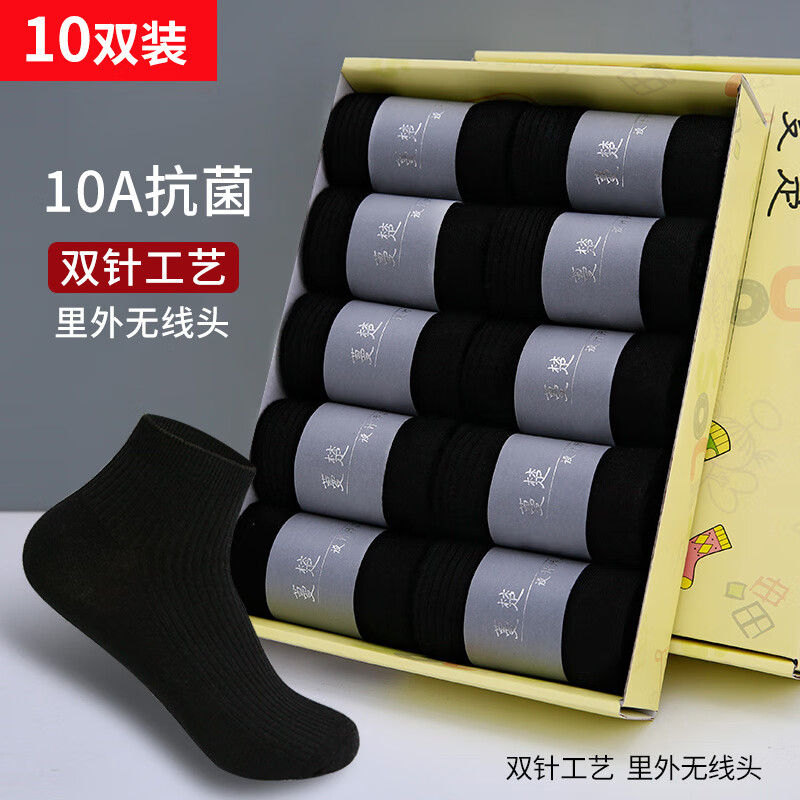 蔓楚10A抗菌男士春夏薄款透气时尚简约纯色男袜(包装随机袋子/盒子) 10黑 10双 均码 (鞋码39-44)