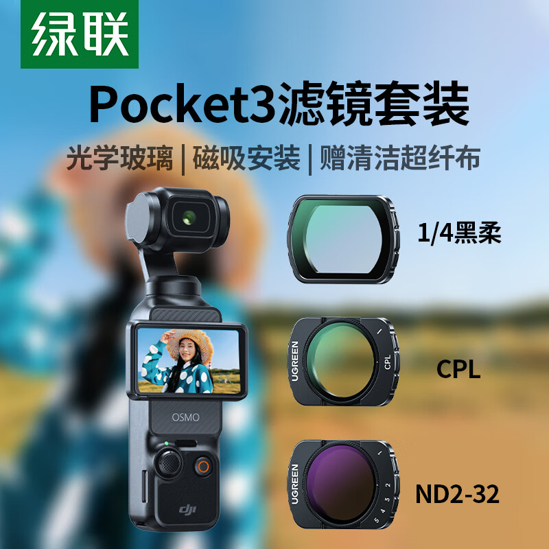 绿联适用大疆pocket3滤镜运动相机滤镜套装口袋相机磁吸安装快拆滤镜黑柔1/4可调nd减光镜CPL偏振镜