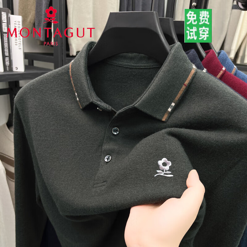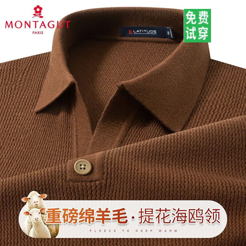 梦特娇(MONTAGUT)【含绵羊毛加厚保暖&波浪提花海鸥领】毛衣男高端翻领针织POLO衫 咖啡色 3XL /56/190/104A[200斤内]