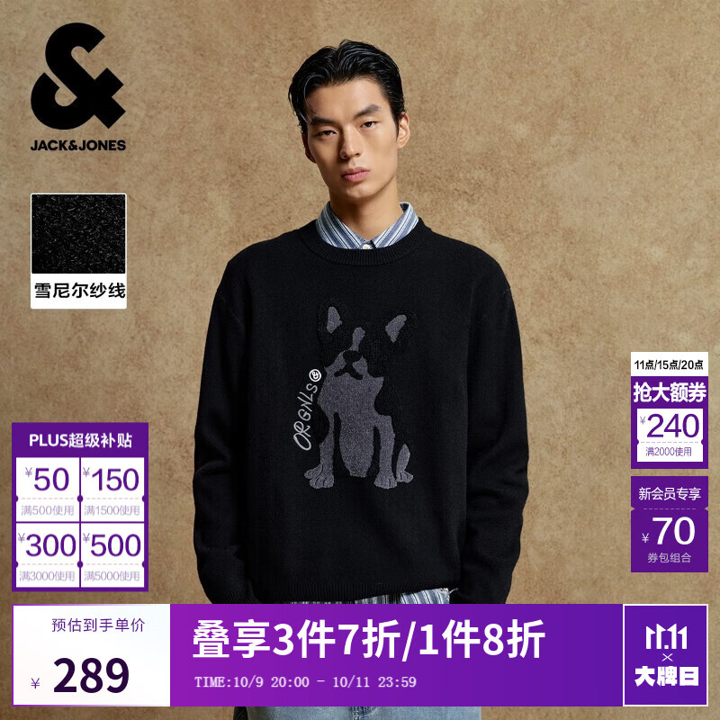 杰克·琼斯(JACK&JONES)男装25年秋冬季毛衣男士雪尼尔亲肤法斗狗宽松休闲圆领针织打底衫 E43纯黑色 常规 M (175)