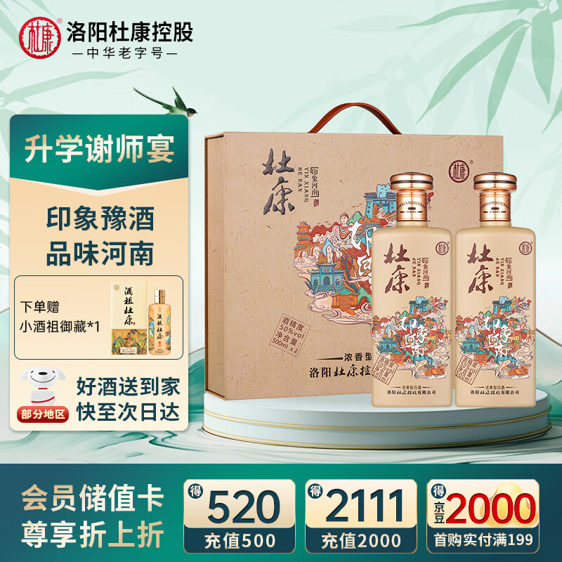 杜康酒祖杜康 印象河南50度礼盒装 纯粮白酒优级酒 送礼家乡酒特产 50度 500mL 2瓶 手提礼盒装