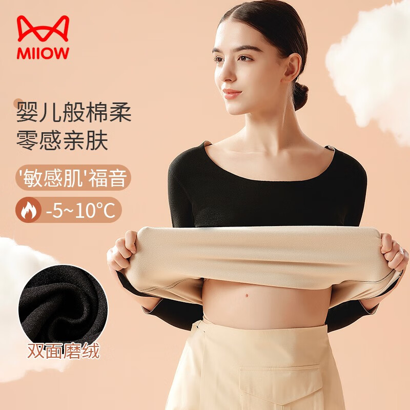 猫人秋冬季女士保暖内衣女式AB面无痕随心裁无痕秋衣上衣单件装 黑色 单件上衣 2XL