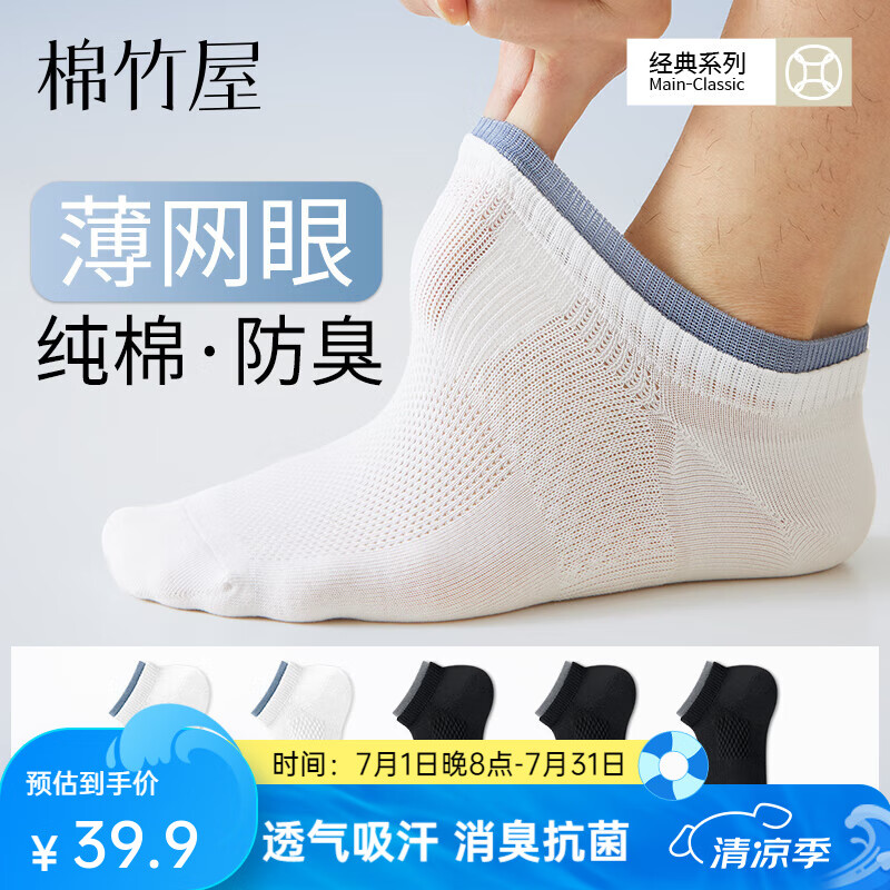 棉竹屋袜子男款夏季薄纯棉网眼短袜抗菌防臭透气吸汗运动男士不掉跟船袜 组合一(2白色+3黑色) 均码 【薄款网眼防臭】