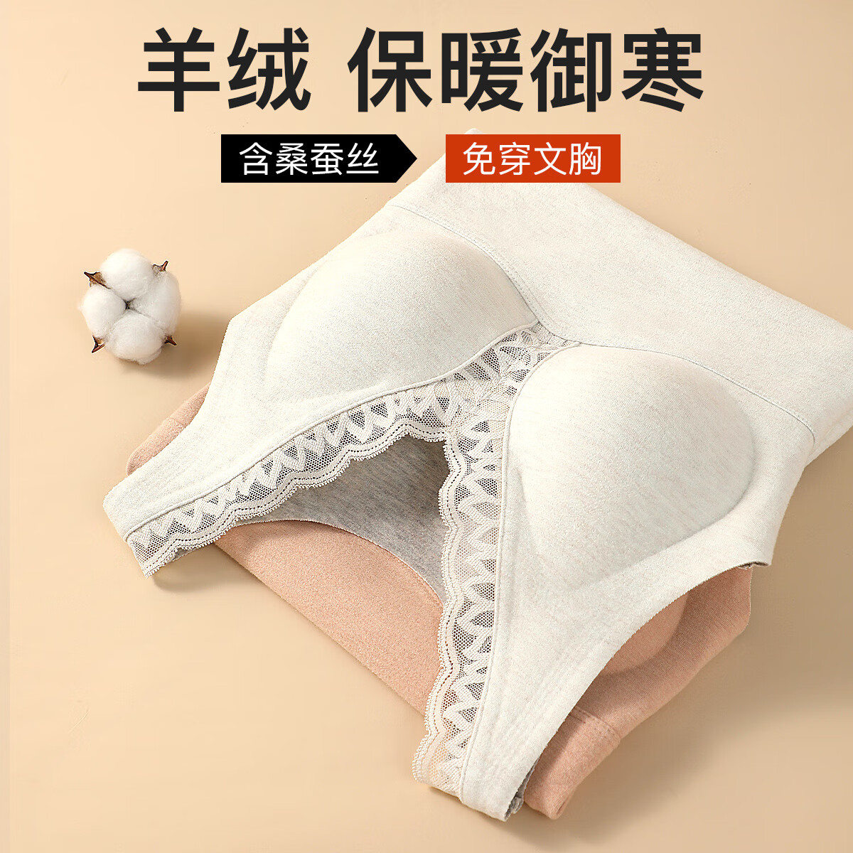 六月玫瑰【免穿文胸】含桑蚕丝山羊绒大码显瘦蕾丝V领保暖内衣保暖背心女 白色 2XL