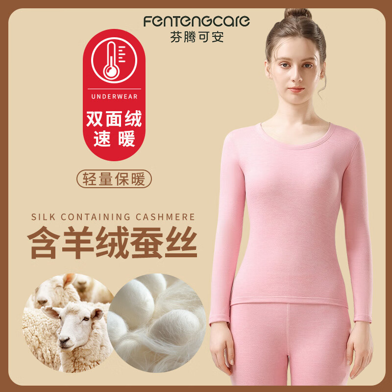 芬腾可安羊绒蚕丝保暖内衣套装男女冬季防寒无痕秋衣秋裤打底情侣保暖内衣 女款-粉色 3XL