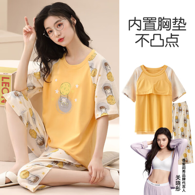 香蜜闺秀GOSO睡衣女【带胸垫防凸点】甜美圆领短袖女士家居服内衣女士 黄色 L